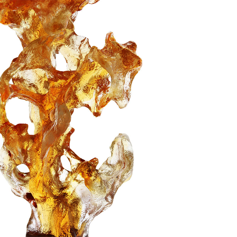 Sa totoo lang, medyo normal para sa mga likhang sining ng salamin na maglaman ng mga bula. Ito ay dahil sa aming paggamit ng lost-wax casting technique, na natural na nagreresulta sa pagkakaroon ng mga bula sa loob ng mga piraso. Ang paraan ng pag-refract ng liwanag sa pamamagitan ng mga panloob na bula na ito ay nagpapakita ng kakaibang kagandahan ng materyal na salamin. Maganda nitong inilalarawan na ang salamin ay tunay na nagsisilbing sisidlan ng liwanag.