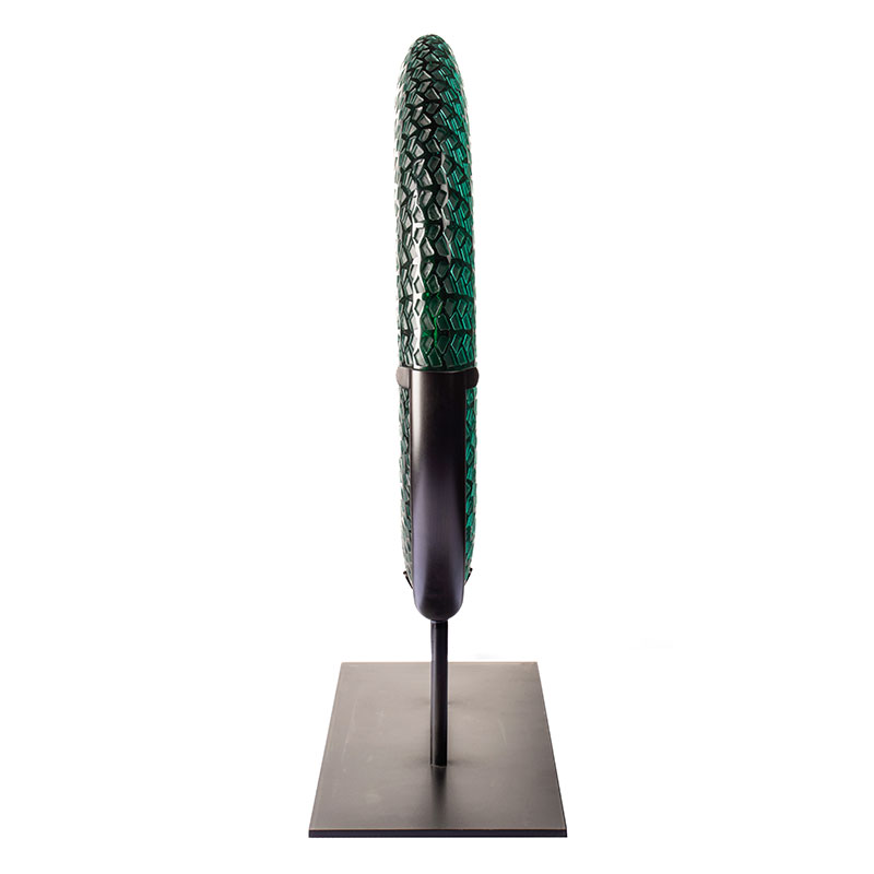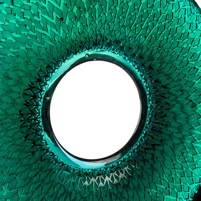 Ang gawa ay gumagamit ng mga dahon ng kawayan bilang natural na inspirasyon nito, na kumukuha ng ethereal na diwa ng luntiang kawayan na umiindayog sa simoy ng kagubatan. Sa pamamagitan ng translucency ng salamin, nagdudulot ito ng isang libong kumikinang na repleksyon ng kawayan. Ang lilim ng luntiang asul na iyon ay sumasalamin sa kasariwaan ng mga kawayan bago sumingaw ang hamog sa umaga at ang banayad na biyaya ng paglipas ng panahon. Ang masalimuot na mga pattern, tulad ng paglalahad ng mga ugat ng dahon ng kawayan, ay may mga patong ng liwanag habang sumasayaw ito sa ibabaw, na kumukuha ng ligaw na espiritu ng bundok sa loob ng pabilog na frame.