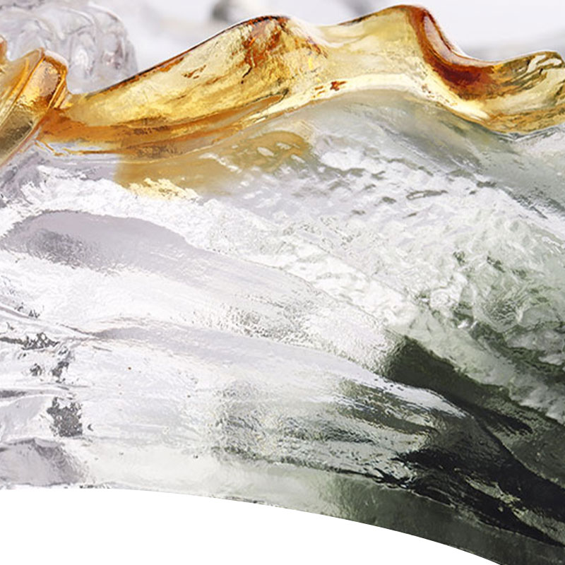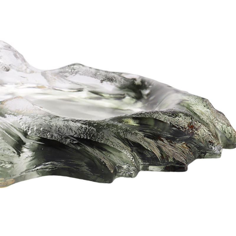 Ang glass fruit plate na ito ay maingat na ginawa gamit ang sinaunang paraan ng nawalang wax. Ang plato ng prutas ay nasa hugis ng isang hugis-itlog na plato, na may mga lumiligid na madilim na berdeng bundok na bumubuo sa katawan ng plato. Malalim at tahimik ang kulay nito, na para bang pinapalapot nito ang lalim at misteryo ng mga bundok at kagubatan.